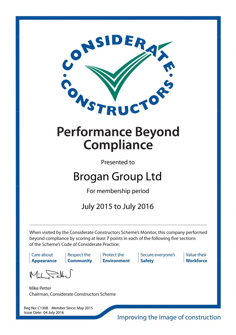 When visited by the Considerate Constructors Scheme’s Auditor, Brogan Group were verified as performing beyond compliance by scoring 7 or more points in each of the following five sections of the Scheme’s Code of Considerate Practice: