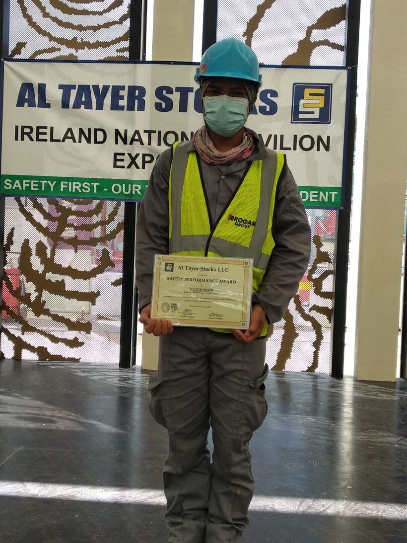 Dinesh Majji, a Brogan scaffolder has been awarded with a safety certificate from the main contractor, Al Tayer Stocks at the Ireland Pavilion Expo 2021 where we are providing the access package.